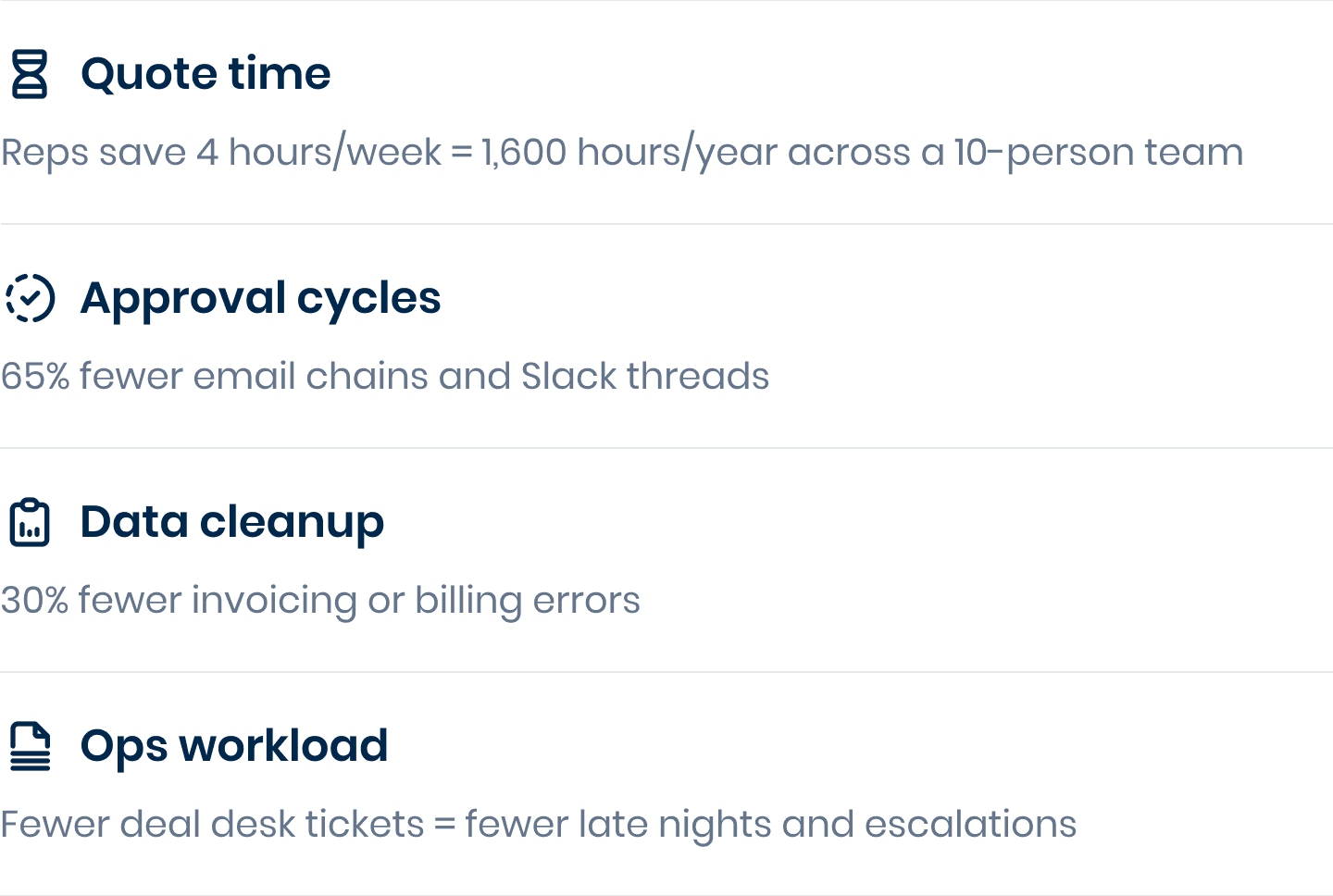 Finance fixes data downstream | Quotes push cleanly into ERP and billing |